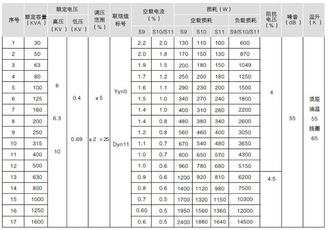 ◆ 10kv組合式變壓器用S9、S10、S11系列油浸式變壓器性能水平